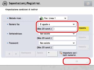 Selezionare [È uguale a] per il numero di destinazione → digitare il numero di fax del partner commerciale → premere [OK].