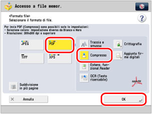 Selezionare il formato di file per l'invio. Ad esempio, selezionare [PDF] → premere [Compresso] → [OK].