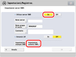 Premere [Impostazioni autentic.SMB] → impostare [Utilizzo autenticazione SMB] su 'On'.