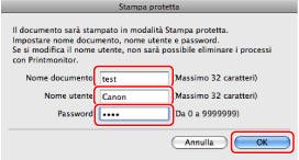 Immettere nome del documento, nome utente e password nella finestra di dialogo [Stampa protetta] → fare clic su [OK].