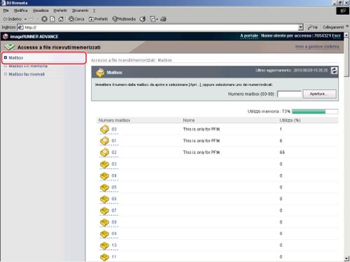 Accedere alla IU remota → fare clic su [Accesso a file ricevuti/memorizzati] → [Mailbox].