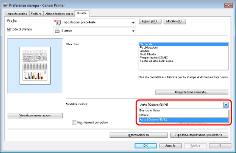 Impostare il modo colore per la stampa