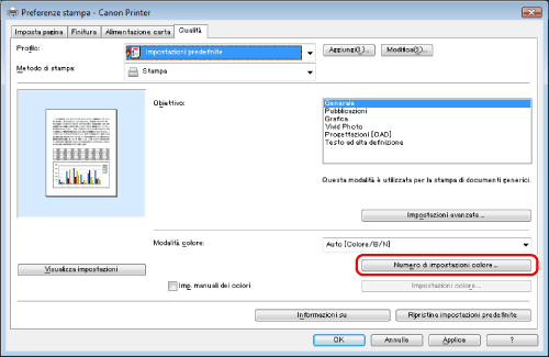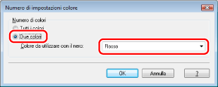 Se [Numero di impostazioni colore] non viene visualizzato, impostare la versione funzione della stampante nella scheda [Impostazioni periferica] (vedere "Impostazione delle opzioni della stampante").