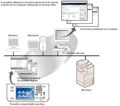 L'IU (interfaccia utente) remota è il software preinstallato che consente di accedere alle funzioni della macchina tramite un browser Web. Ad esempio, l'IU remota consente di accedere alla macchina per controllare lo stato dei processi, la loro esecuzione e per specificare varie impostazioni. Per poter utilizzare l'IU remota, è necessario un browser Web e una connessione di rete tra il computer e la macchina. Inoltre, occorre immettere un indirizzo IP (Internet Protocol) dal pannello comandi e configurare la connessione di rete.