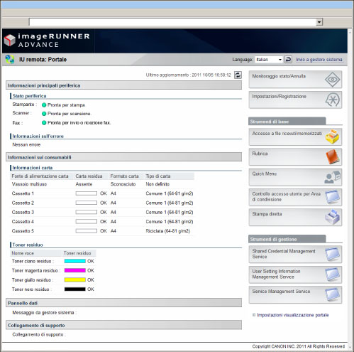 L'IU remota consente di accedere alla macchina dalla rete, permettendo così di visualizzare lo stato attuale della macchina e le impostazioni attive, nonché lo stato di tutte le informazioni e dell'elaborazione dei processi. La macchina può essere utilizzata tramite il computer collegato in rete, senza dover eseguire alcuna operazione sulla macchina stessa. Immettendo l'indirizzo IP della macchina nel browser web, sulla schermata del computer viene visualizzata la pagina iniziale o la schermata principale della IU remota, come illustrato di seguito: