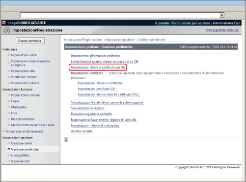 È possibile utilizzare l'IU remota per installare la coppia di chiavi, il certificato di utente e l'elenco delle revoche dei certificati necessari per le firme degli utenti nella macchina.