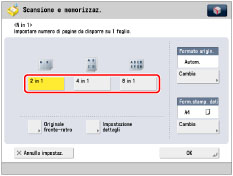Questa impostazione riduce otto originali a un lato o quattro originali in fronte-retro per riprodurli su un lato di un foglio.
