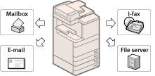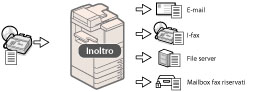 È possibile configurare l'unità per inoltrare automaticamente i documenti I-fax ricevuti, rispondenti alle condizioni di inoltro specificate, a qualsiasi destinazione indicata utilizzando i parametri di invio desiderati. I documenti I-fax ricevuti possono essere inoltrati a un'altra macchina (funzione rilancio) o memorizzati in una mailbox per fax riservati. È inoltre possibile attivare l'inoltro automatico ad un'ora programmata. Poiché è possibile inoltrare alle destinazioni desiderate anche i documenti ricevuti che non corrispondono alle condizioni di inoltro, si può utilizzare questa funzione per ordinare i documenti I-fax ricevuti e distribuirli alle destinazioni appropriate.