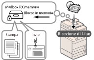 I documenti I-fax ricevuti possono essere registrati nella mailbox RX memoria senza essere stampati. È possibile verificare le informazioni del mittente e il numero di pagine di un documento, prima di stamparlo o di inoltrarlo a un'altra destinazione.