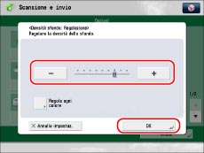 Se si regola la densità sfondo premendo [Regola] per <Densità sfondo>, l'impostazione [Autom.] viene annullata. Allo stesso modo, se si preme [Autom.] durante la regolazione manuale in [Regola], le regolazioni vengono annullate. La macchina regola automaticamente la densità in base allo sfondo.