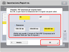 Questa impostazione è valida solo quando il formato del file è [PDF (Compresso)] ed è selezionato [Testo] per [Tipo di originale] in [Opzioni] in "Scansione e invio" o "Scansione e memorizzazione".