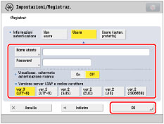 Se la versione del server LDAP è la 3, non è necessario specificare [Posizione inizio ricerca]. (Se la versione del server LDAP è la 3, la macchina preleva automaticamente le impostazioni dal server e imposta la posizione di inizio ricerca). Se la versione del server LDAP è la 2, è invece necessario specificare [Posizione inizio ricerca].