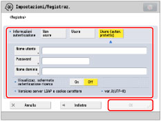 Premere [Impostazione destinazione] → [Registrazione server LDAP] → [Registra].