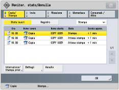, viene visualizzata la schermata Monitoraggio stato/Annulla, dalla quale è possibile controllare e variare lo stato dei lavori di copiatura/stampa, invio, ricezione e memorizzazione.