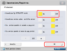 Premere [Protezione] → selezionare [On] per <Visualizza Pg HTTPS/HTTP misti> → premere [OK].