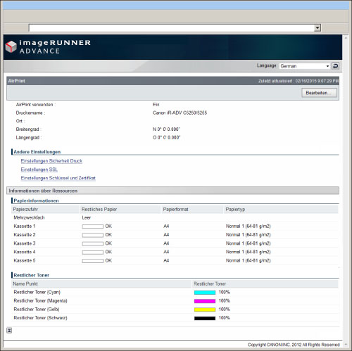 Hier können Sie die Werte prüfen, die in den AirPrint-Einstellungen eingegeben wurden, wie Name und Standort des Geräts. Sie können auf [Bearbeiten...] klicken, um die Einstellungen zu ändern.