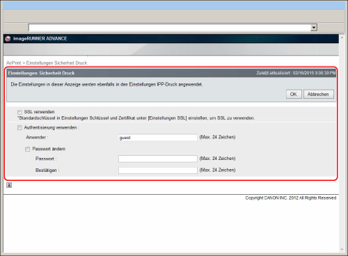 Die eingestellten Werte für [Einstellungen IPP-Druck] (Einstellungen/Speicherung) werden mit den in [Einstellungen Sicherheit Druck] enthaltenen Werten geändert.
