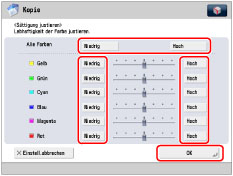 Wählen Sie die Farbe, die Sie einstellen wollen → Berühren Sie die Taste [-] oder [+], um die Dichte für dunkle (hoch), mittlere und hellere (niedrig) Bereiche zu justieren → Bestätigen Sie durch Berühren der Taste [OK].