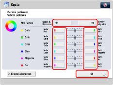 Wählen Sie die Taste mit der Einstellung zur Farbabstimmung, die Sie aufrufen wollen → Prüfen Sie die Einstellungen → Bestätigen Sie durch Berühren der Taste [OK].
