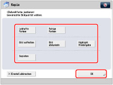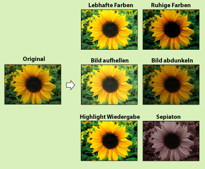 Sie können den farbigen Gesamteindruck eines Drucks durch Berühren einer einzigen Taste verändern. Folgende sechs Möglichkeiten sind verfügbar.