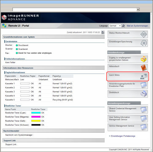 Nur der Systemverwalter oder SSO-H-Administrator (Administrator)/Netzwerkadministrator (NetworkAdmin)/Geräteadministrator (DeviceAdmin) kann die Expressmenü-Seite bedienen. Nähere Informationen zu den unterschiedlichen Arten von Administratoren finden Sie im Abschnitt "Administratoreinstellungen".