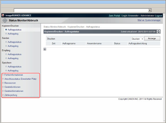 Hier werden der aktuelle Status der Einheit, z. B. Papiervorrat und Informationen zur Wartung (Verbrauchsmaterial) angezeigt.