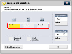 Mit dieser Funktion können Sie mehrere Originale oder doppelseitige Originale scannen und auf einem Blatt anordnen. Sie können festlegen, ob Sie 2, 4 oder 8 gescannte Originale auf der Seite anordnen möchten. Sie können auch doppelseitigen Druck festlegen und das Layout und die Reihenfolge der Bilder ändern.
