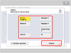 Establezca el tamaño de los sobres en el mismo tamaño que el de los sobres cargados en la bandeja multiuso.