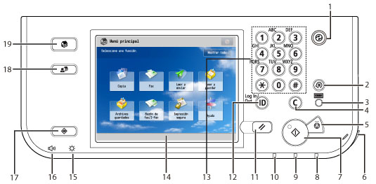 Se pulsa para establecer o cancelar el modo de reposo. Se ilumina cuando el equipo entra en el modo de reposo. Para más información sobre el modo de autorreposo, consulte "Alimentación principal y tecla de ahorro de energía". |