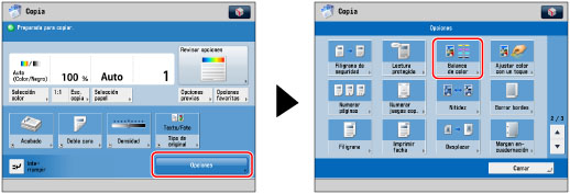 Seleccione la tecla que contenga las opciones de balance de color que desee recuperar → verifique las opciones → pulse [Aceptar].