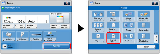También es posible ajustar la posición de la fecha. (Consulte "Guardar/editar/eliminar texto definido por el usuario para números de página y filigranas".)