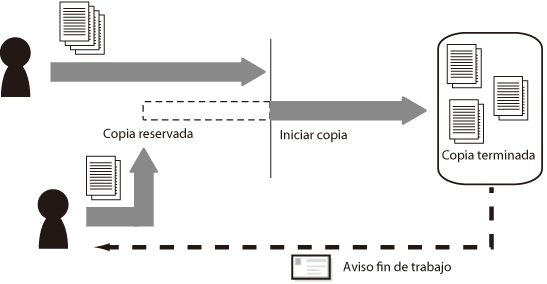 Cuando el equipo está procesando un trabajo, no podrá iniciar un nuevo trabajo hasta que se complete el trabajo actual. Por ejemplo, si se está procesando un trabajo de copia voluminoso, deberá esperar a que termine por completo el trabajo de copia. En este caso, podrá emplear el modo de copia reservada para leer originales mientras se esté procesando un trabajo de copia, y empezar a copiar justo después de haber terminado el trabajo actual. La especificación de recepción de un aviso al terminar el trabajo de copia también le ayudará a procesar con eficacia el trabajo de copia.