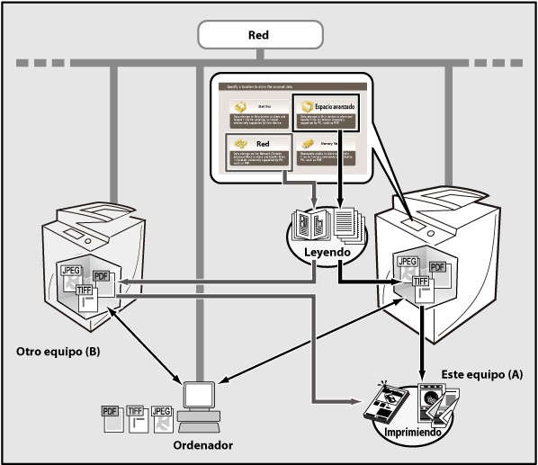 Espacio avanzado de imageRUNNER ADVANCE es una ubicación de almacenamiento para compartir información. Permite comunicar información sin necesidad de usar papel mediante el almacenamiento de documentos escaneados a los que los usuarios pueden acceder desde sus equipos.