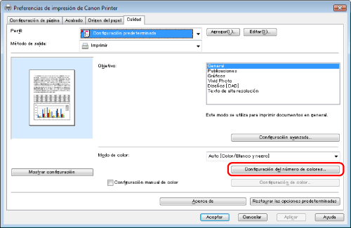 Si no se muestra la opción [Configuración del número de colores], establezca la versión de las funciones de la impresora en la ficha [Configuración del dispositivo] (consulte " Configuración de las opciones de impresora").