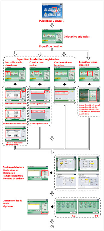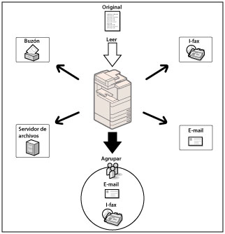 Se pulsa para seleccionar y utilizar otros modos disponibles para leer y enviar. Configure funciones de envío útiles, como enviar juntos originales de distinto tamaño o enviar originales de doble cara.