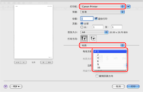 选择打印机→[布局]→从[每张页数]中选择要打印在一张纸上的页数。