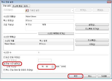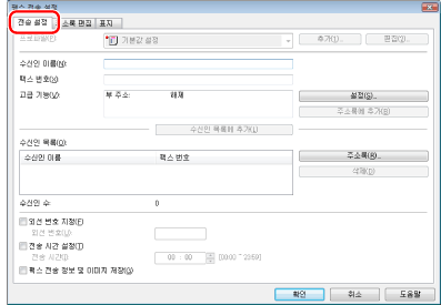 [기타] 탭의 [보안 설정] 대화상자에서 [수신인을 [수신인 목록]에 추가하기 전에 팩스 번호 다시 입력하기]를 선택한 경우 [수신인 목록에 추가]를 클릭하면 [수신인 확인] 대화상자가 표시됩니다. 자세한 내용은 온라인 도움말을 참고하십시오("온라인 도움말 보기" 참고).