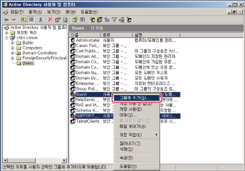 'Canon Peripheral Admins' 그룹에 추가할 사용자 계정을 오른쪽 버튼으로 클릭합니다.