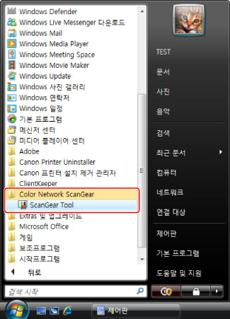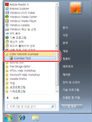 Windows XP의 경우 [시작] → [모든 프로그램] → [Color Network ScanGear] → [ScanGear 도구]를 차례로 클릭합니다. Windows Vista/Windows 7의 경우 [