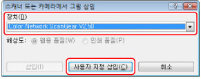 [장치]에서 Color Network ScanGear를 선택하고 → [사용자 지정 삽입]을 클릭합니다.