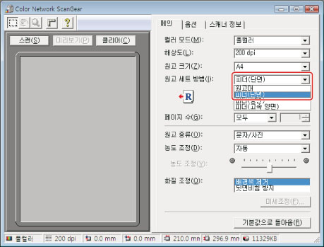 피더에 세트한 원고를 스캔하려면 [원고 세트 방법]에서 피더를 선택하세요.