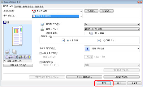 프린터 드라이버 화면의 각 시트에서 인쇄 설정을 지정한 다음 → [확인]을 클릭합니다.