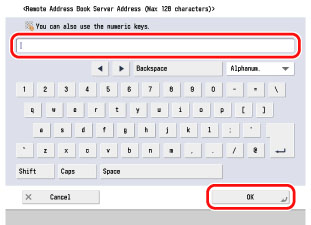 (설정/등록) → [수신인 설정] → [리모트 주소록 취득 설정] → [리모트 주소록 서버주소]을 누릅니다.
