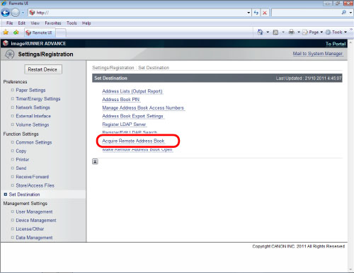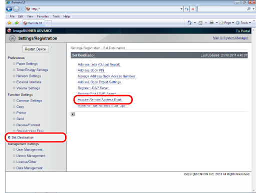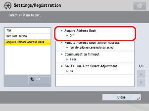 리모트 UI에 액세스하고 → [설정/등록] → [수신인 설정] → [리모트 주소록 취득 설정]을 클릭합니다.