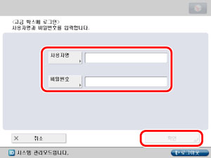 "사용자 정보 등록"의 5단계에서 설정한 사용자 이름 및 비밀번호를 입력하고 → [확인]을 누릅니다.
