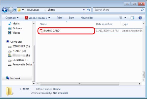 스캔한 명함을 기기의 고급 스페이스, 네트워크에 있는 또 다른 기기의 고급 스페이스 또는 메모리 미디어에 저장합니다.
