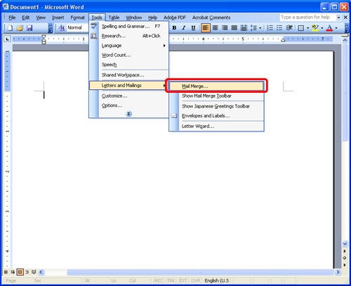 Microsoft Word에서 새 문서를 열고 → [도구] → [편지 및 우편물] → [편지 병합]을 클릭합니다.