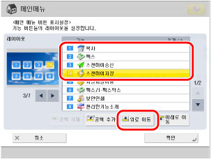 이 절에서는 터치 패널 화면에 [복사], [스캔하여 저장], [팩스] 및 [보안인쇄]와 같은 네 가지 유형의 키가 순서대로 표시되도록 설정하는 방법에 대해 설명합니다.