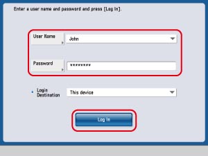 iW Function Flow가 설치된 기기의 로그인 화면에서 [사용자명] 및 [비밀번호]를 입력하고 → [로그인]을 누릅니다.