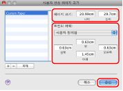 Mac OS X 10.5 이상에서는 사용 중인 응용 프로그램에 따라 [페이지 설정] 대화상자가 표시되지 않을 수도 있습니다. 이 경우 [파일] 메뉴에서 [인쇄]를 선택하면 표시되는 [인쇄] 대화 상자에서 다음의 설정을 지정하십시오.
